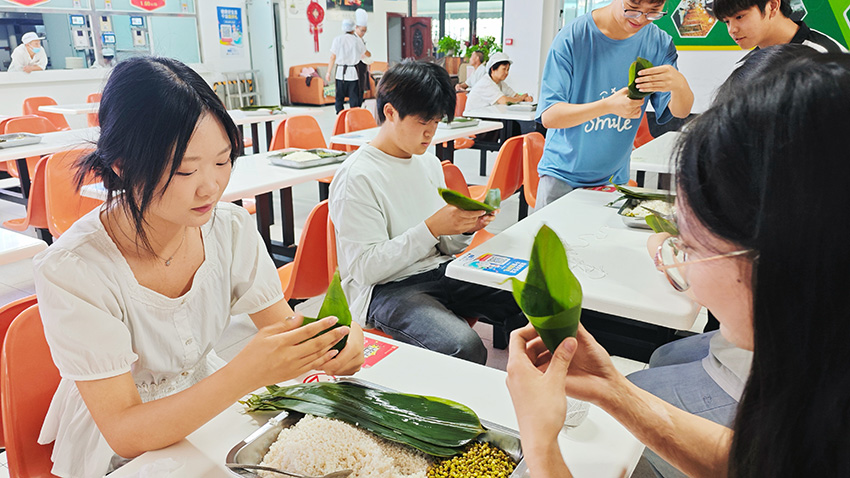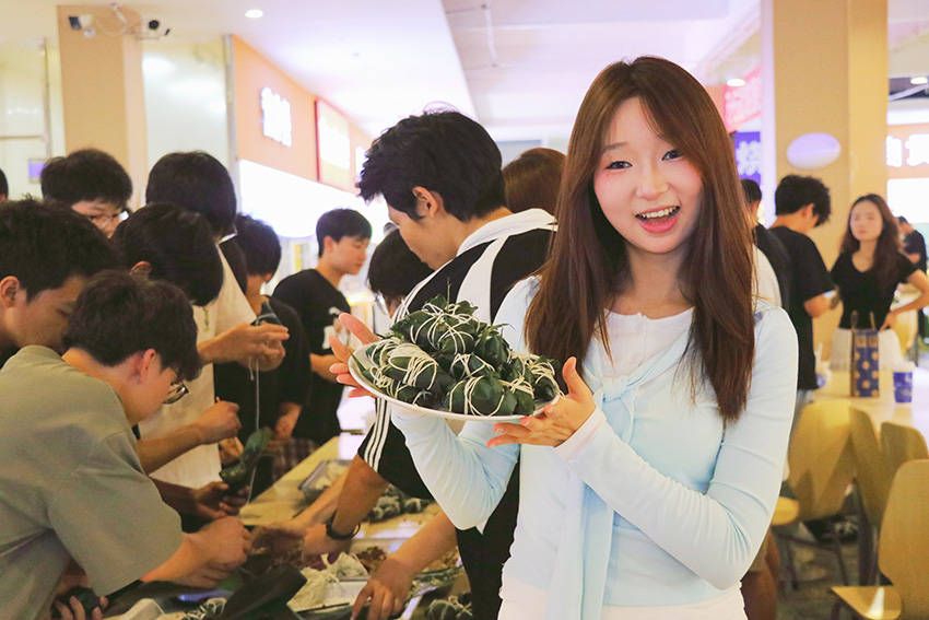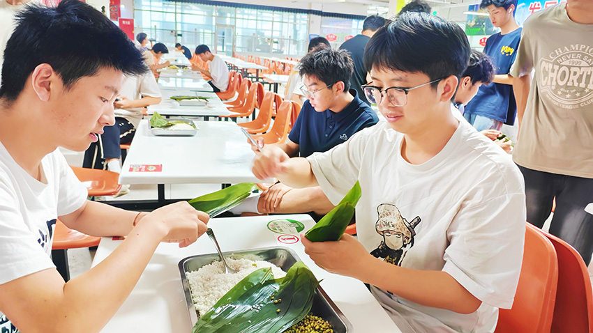 走进食堂,便可见一派忙碌温馨的景象。多个班级的同学齐聚一堂,亲手体验包粽乐趣。翠绿的粽叶、晶莹的糯米、细韧的棉线在同学们手中翻转缠绕。从生疏到熟练,大家互帮互助,交流技巧,食堂内外洋溢着阵阵欢声笑语。当亲手包裹的粽子蒸腾出袅袅热气,馥郁的粽香不仅弥漫在空气中,更让同窗情谊在协作与分享中悄然升温。