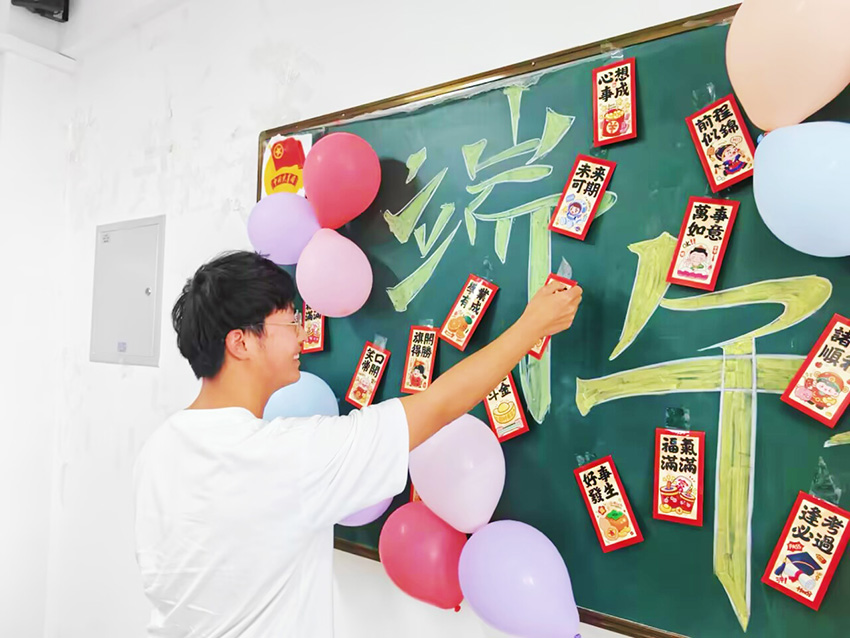 当传统佳节遇上青春活力,操场、教室瞬间成为欢乐的海洋。形式多样的端午主题小游戏吸引了众多学子:猜灯谜考验智慧,思接千载;端午成语接龙妙趣横生,寓教于乐;最激动人心的当属“旱地赛龙舟”——同学们化身“桨手”,在号子声与助威声中奋力“划行”,以别开生面的方式体验团结协作的龙舟精神,在挥洒汗水间强健体魄,感悟传统文化的蓬勃生命力。