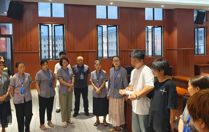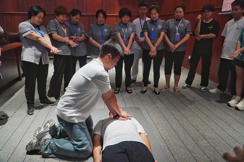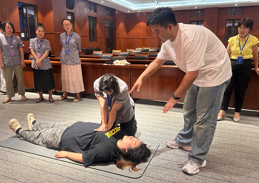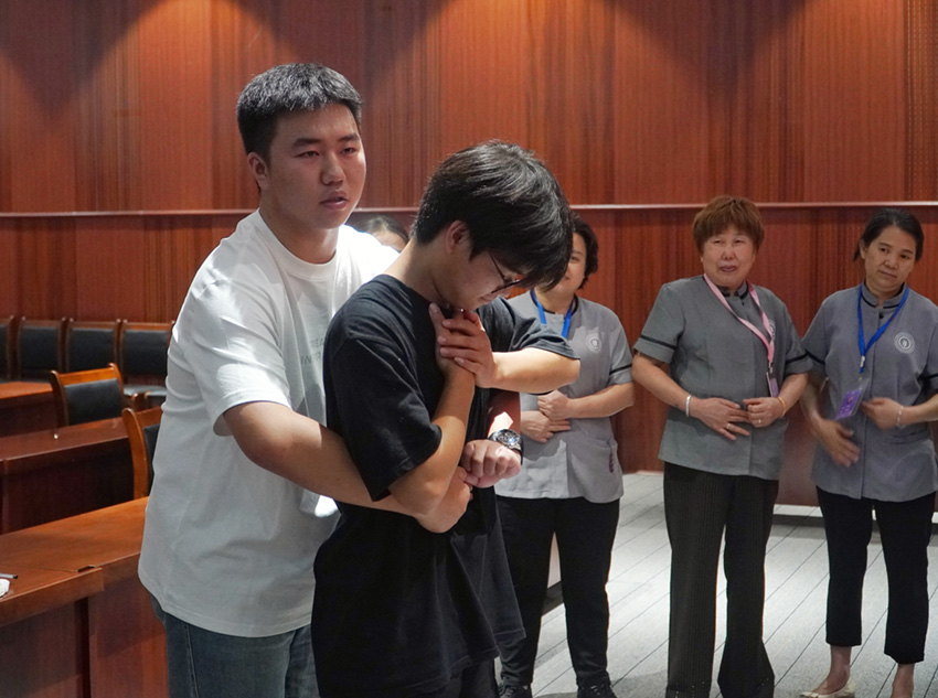 在实操环节,红十字会认证救护员向宣灵分步骤进行现场教学。针对心肺复苏,他详细演示了环境评估、意识判断、规范按压与人工呼吸等标准化流程;针对气道异物梗阻,指导管理员掌握海姆立克急救法的适用场景与操作技巧;在讲解癫痫突发状况应急处置时,重点强调了保护患者安全、避免二次伤害等关键要点。