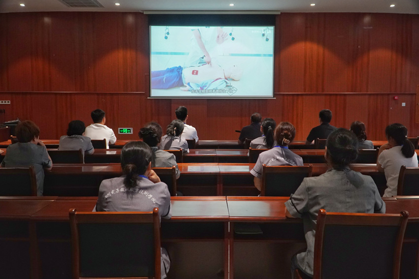 培训第一阶段,全体人员共同观看了应急救护教学视频。视频通过动画演示与真人示范相结合的方式,系统讲解了包括心肺复苏(CPR)、海姆立克急救法、癫痫发作应急处置等关键技能的操作步骤与注意事项,为后续实操环节奠定扎实基础。